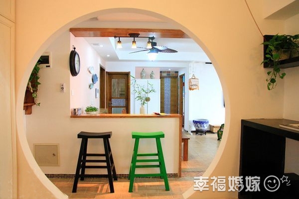 餐桌旁边做了一小小的隔断,放上两把吧台凳,也可以当做吧台使用。设计师将富有园林风味的圆形门搬进我的家中,这样是不是有种亭台楼阁的味道呀。